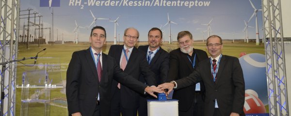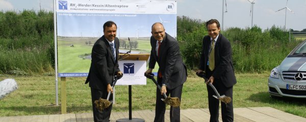 Der erste Spatenstich für das Demonstrations- und Innovationsprojekt wird am 07.07.2011 durch Herrn Erwin Sellering (Ministerpräsident des Landes Mecklenburg-Vorpommern; Mitte), Herrn Dr. Oliver Ehret (Programmleiter Wasserstoff-Bereitstellung, Nationale Organisation Wasserstoff- und Brennstoffzellentechnologie (NOW GmbH); rechts) und Herrn Carlo Schmidt (Geschäftsführer WIND-WASSERSTOFF-projekt GmbH & Co. KG; links) durchgeführt.